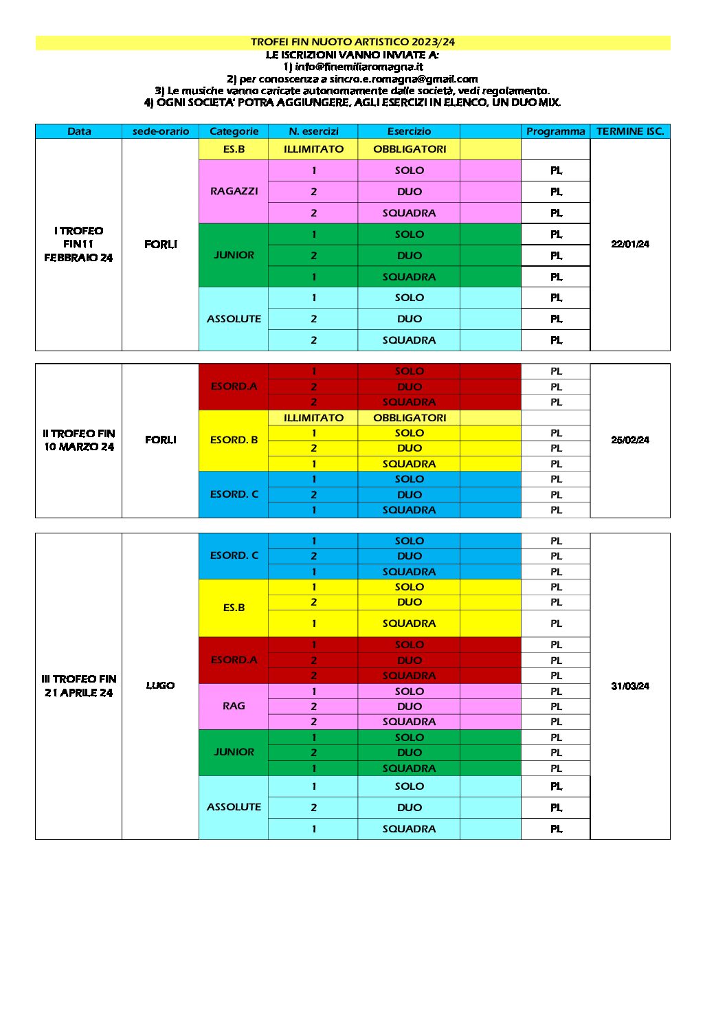 MANIFESTAZIONE:        1° CAMPIONATO REGIONALE FIN - propaganda   DATA:    Domenica 11 Febbraio   LOCALITA’:  Lugo - Piscina comunale di Lugo - Piazzale Veterani dello Sport, 2 (RA)   CATEGORIE: RAGAZZE, JUNIOR, ASSOLUTE. + ES.B (solo obbligatori)     PROGRAMMA Obbligatori Es.B: Riscaldamento ore 13:30 Inizio gare ore 14:00   Liberi: Riscaldamento Solo e Duo ore 15:00 Riscaldamento Squadra ore 15:15 Inizio gara 15:30/45