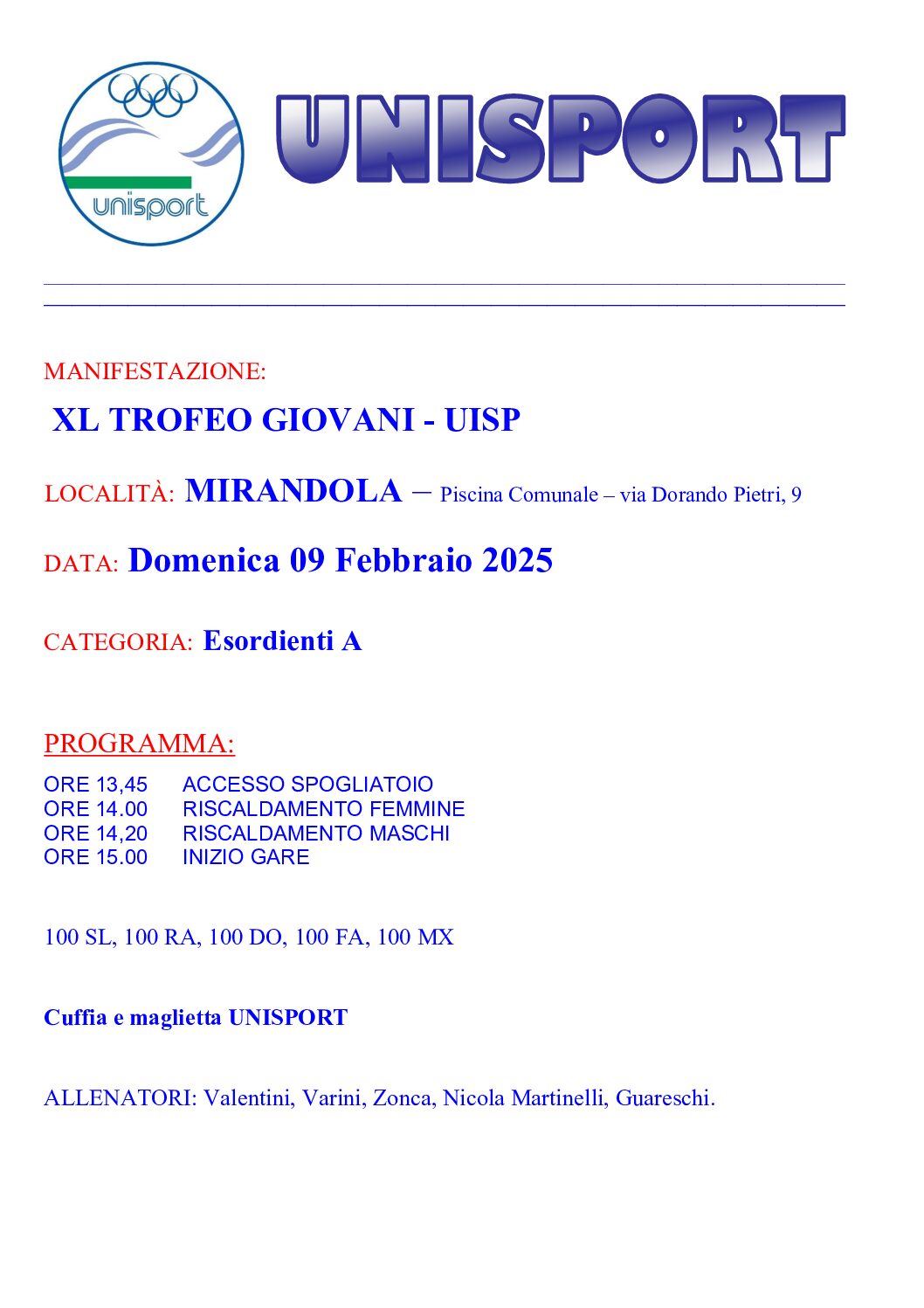 MANIFESTAZIONE:  XL TROFEO GIOVANI - UISP   LOCALITÀ: MIRANDOLA – Piscina Comunale – via Dorando Pietri, 9   DATA: Domenica 09 Febbraio 2025   CATEGORIA: Esordienti A   PROGRAMMA:   ORE 13,45      ACCESSO SPOGLIATOIO ORE 14.00      RISCALDAMENTO FEMMINE ORE 14,20      RISCALDAMENTO MASCHI ORE 15.00      INIZIO GARE     100 SL, 100 RA, 100 DO, 100 FA, 100 MX   RISULTATI: https://www.goandswim.com/follow/PublicEvent.aspx?Event=51bff00cadec41dd8cec00087e7a3a96