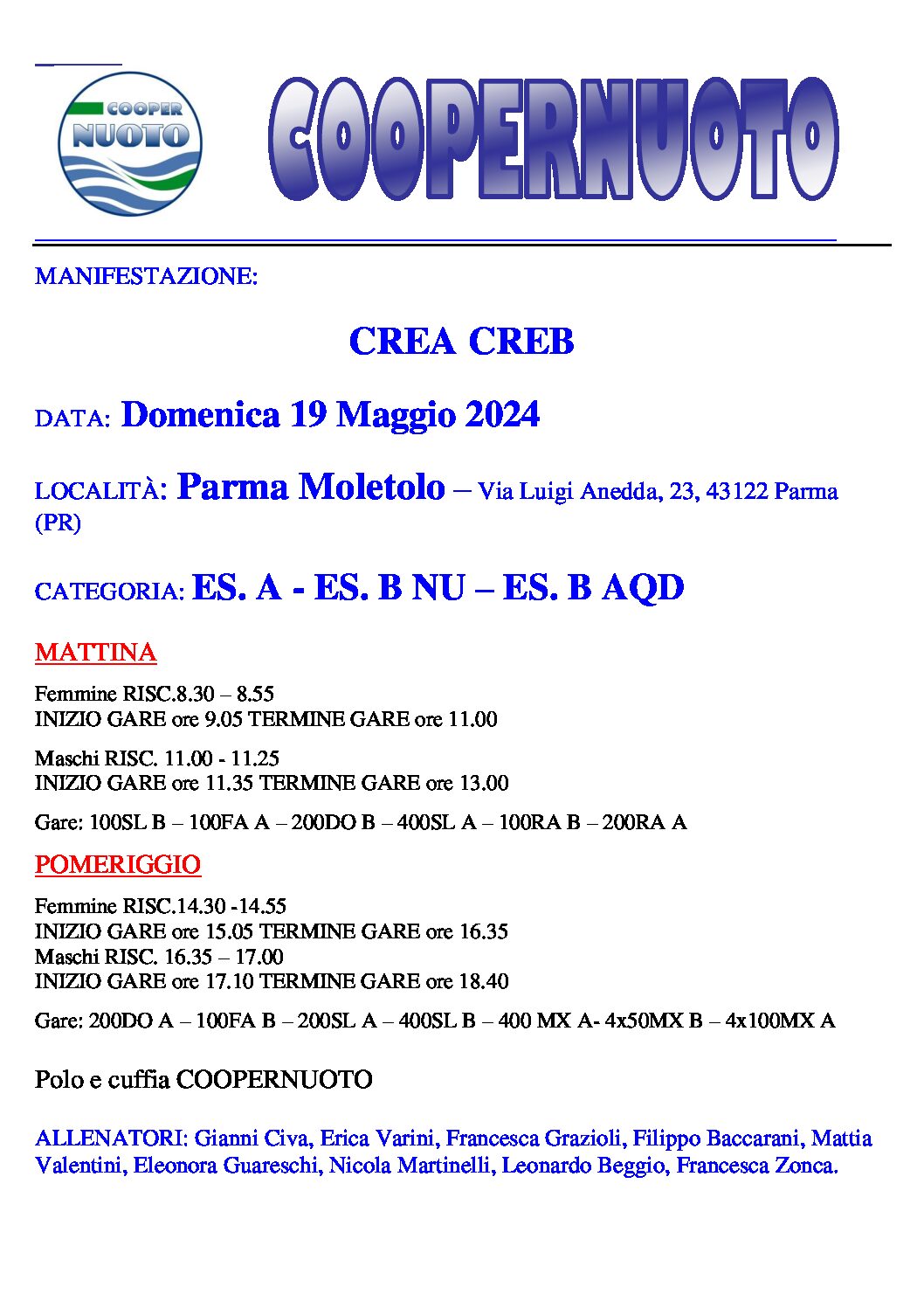 Gare: 200DO A – 100FA B – 200SL A – 400SL B – 400 MX A- 4x50MX B – 4x100MX A