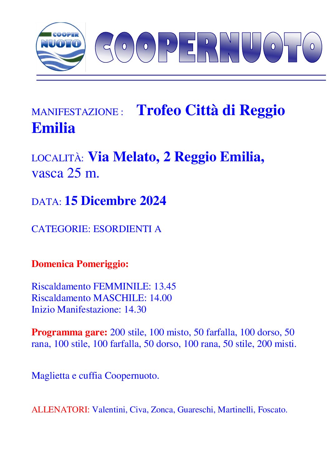 RISULTATI:https://www.coopernuoto.it/cms/wp-content/uploads/2024/10/Riepilogo-risultati-esordienti-Reggio-Emilia-1.pdf